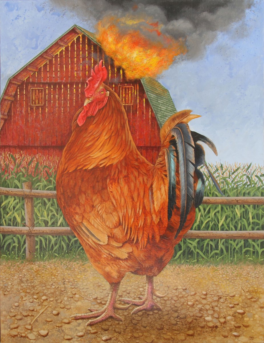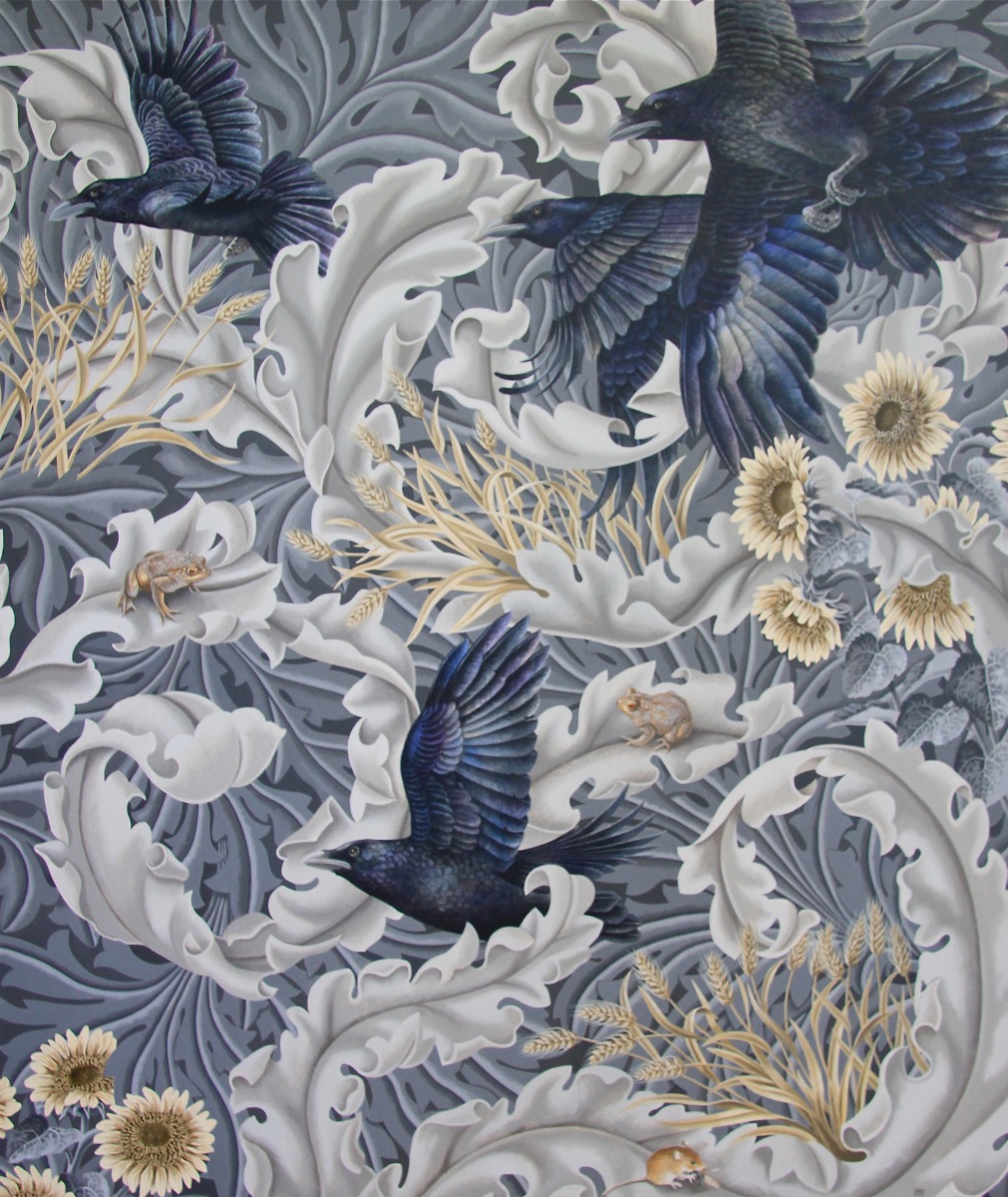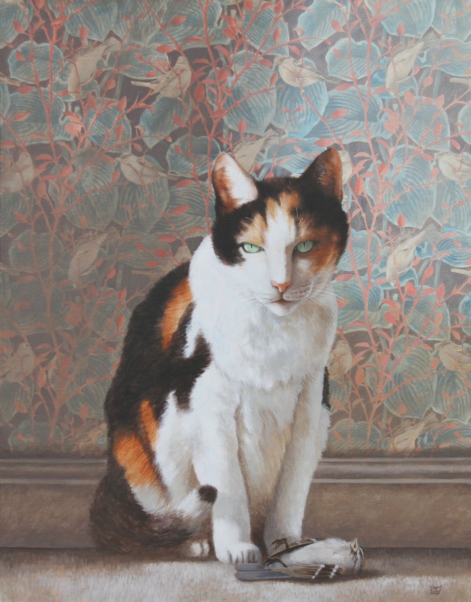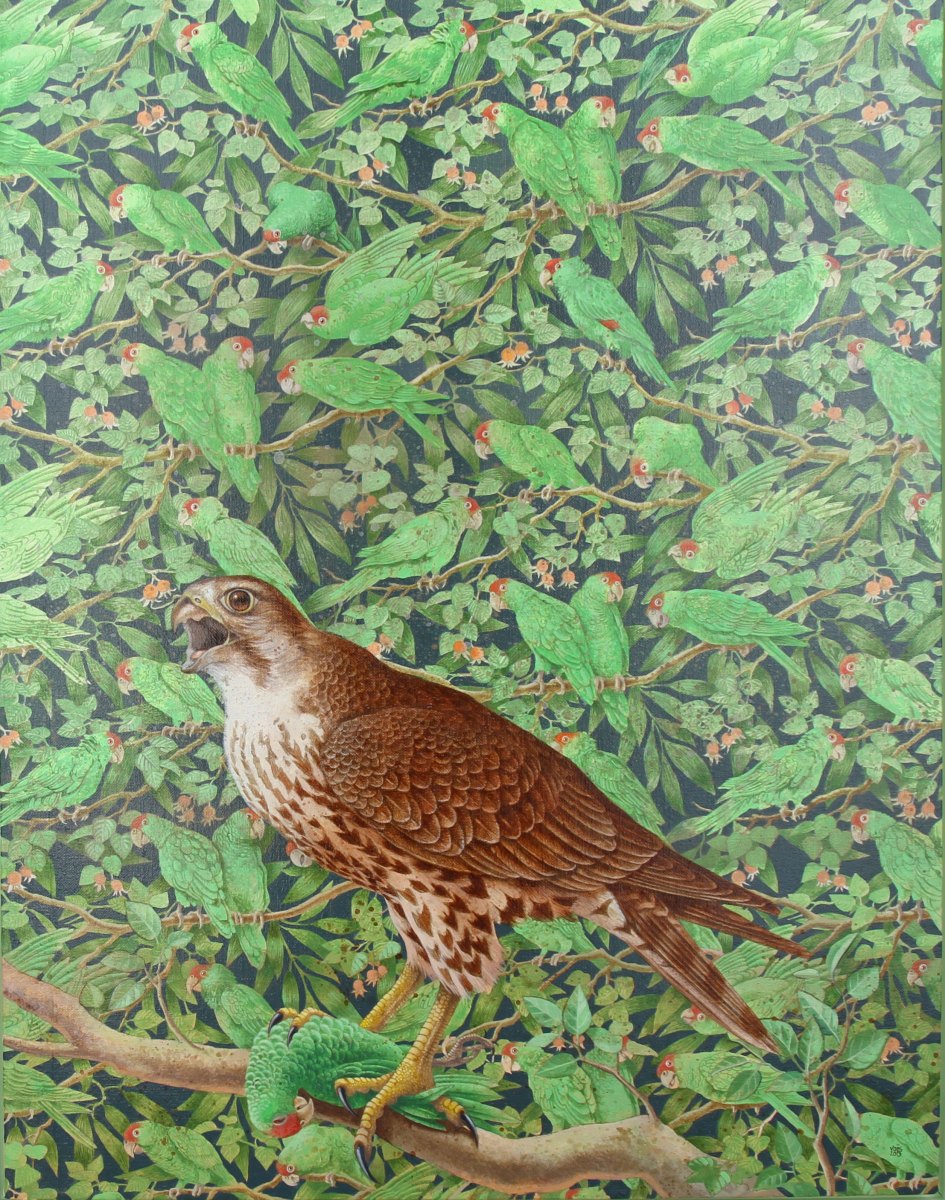 In my large canvases of animals, I focus on painting with a deep sense of realism and detail, drawing inspiration from earlier masters like Rosa Bonheur and George Stubbs. I approach each subject with reverence and love, capturing not only their natural beauty but also, at times, the humor or horror of their predatory instincts. My work sometimes features these animals as prominent figures in the foreground, set against intricate repeat pattern backgrounds, adding depth, complexity, and irony to the scene. In some pieces, I incorporate literary, mythological, and biblical themes—using references like Zeus or David and Goliath—to further explore the timeless stories that animals can evoke. Through my art, I aim to honor the dignity and spirit of the animal world while engaging with the broader narratives that connect us all.