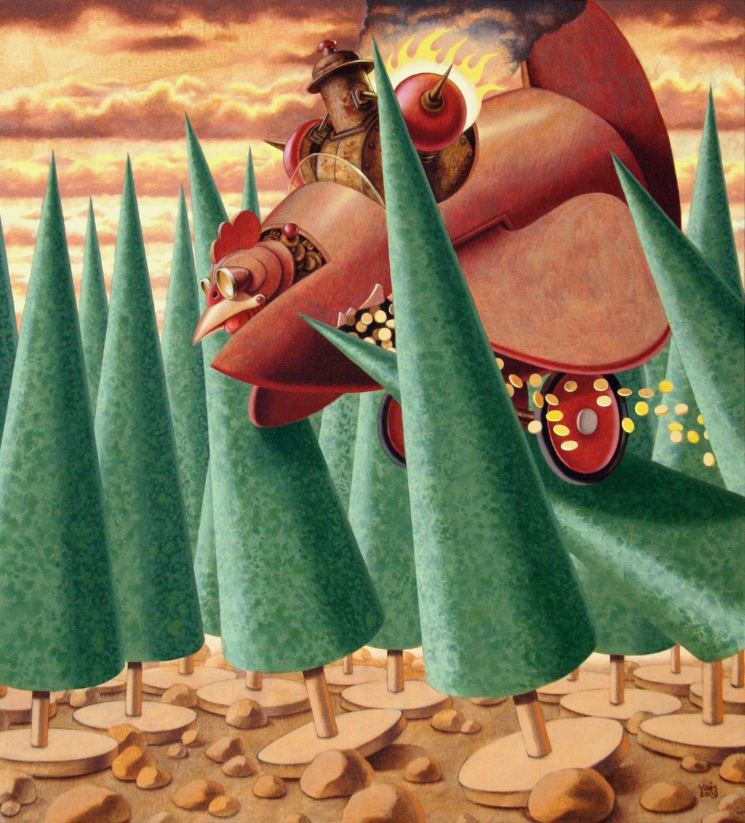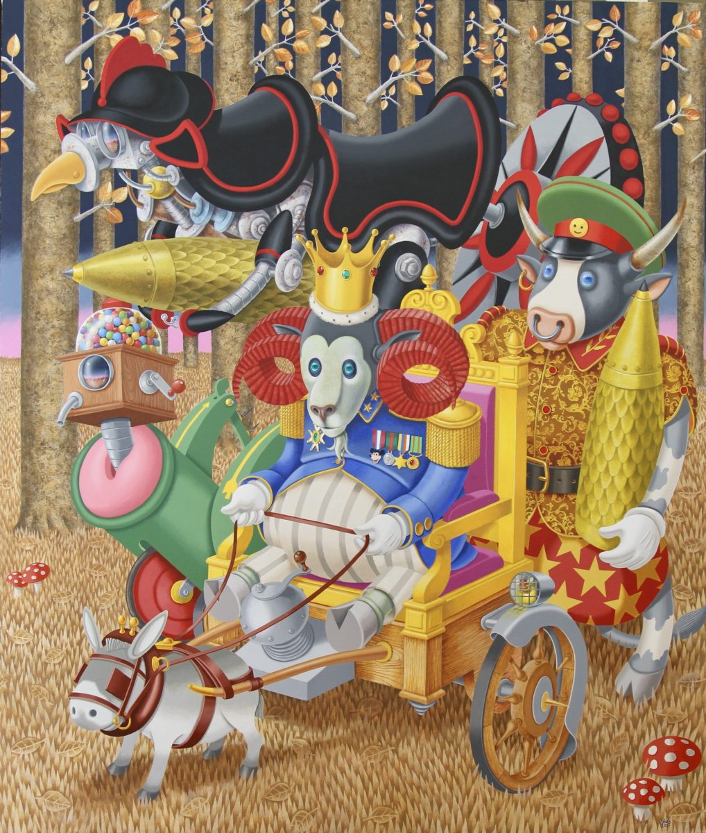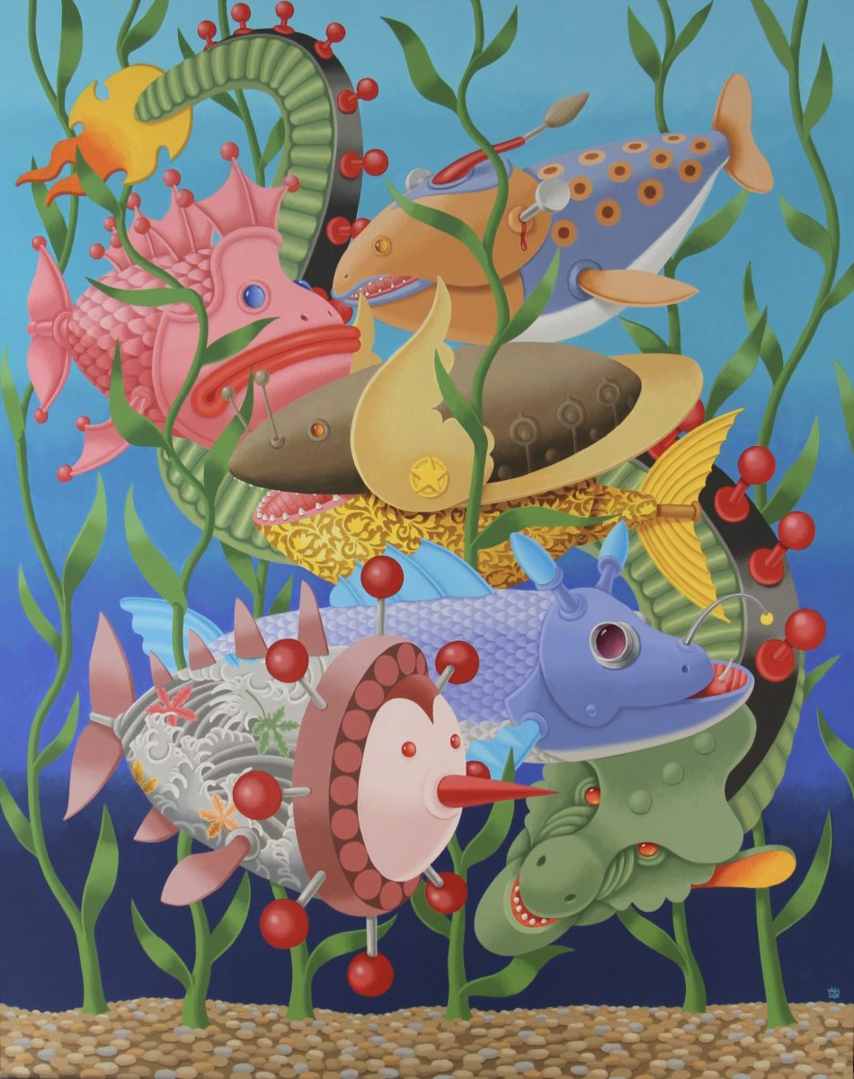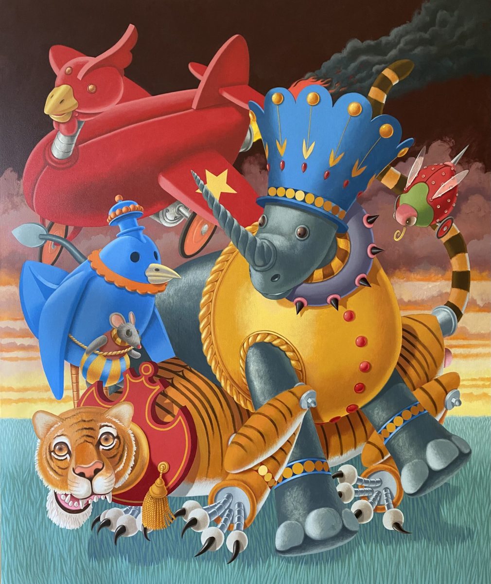 In my Imagination Chamber series, I explore the playful and the surreal through whimsical, meticulously rendered animals set in fantastical landscapes. Using super-saturated colors and a cartoon-like gloss, I aim to create an immersive world where humor and imagination merge, often punctuated by puns in the titles. My work bridges the boundary between the familiar and the absurd. Creatures—both real and imagined—inhabit these vibrant scenes, inviting viewers to step into a universe where fantasy reigns.