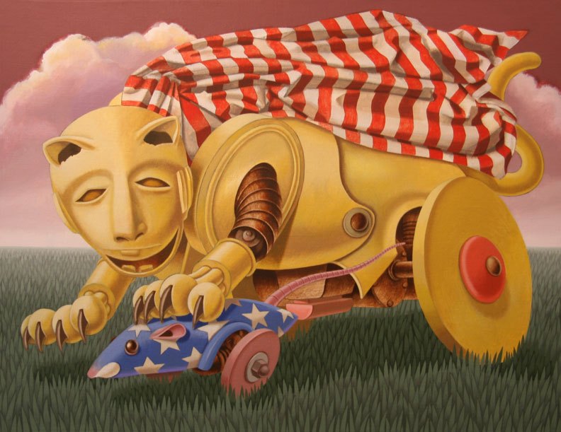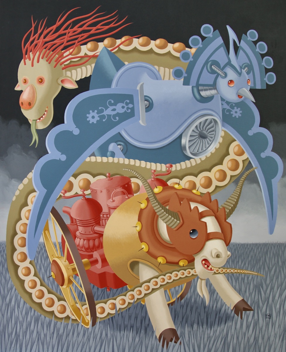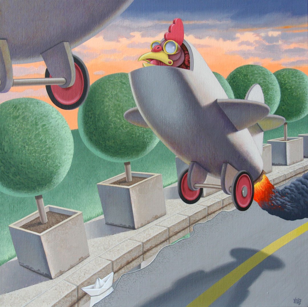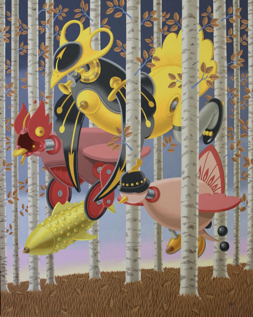 In my Imagination Chamber series, I explore the playful and the surreal through whimsical, meticulously rendered animals set in fantastical landscapes. Using super-saturated colors and a cartoon-like gloss, I aim to create an immersive world where humor and imagination merge, often punctuated by puns in the titles. My work bridges the boundary between the familiar and the absurd. Creatures—both real and imagined—inhabit these vibrant scenes, inviting viewers to step into a universe where fantasy reigns.